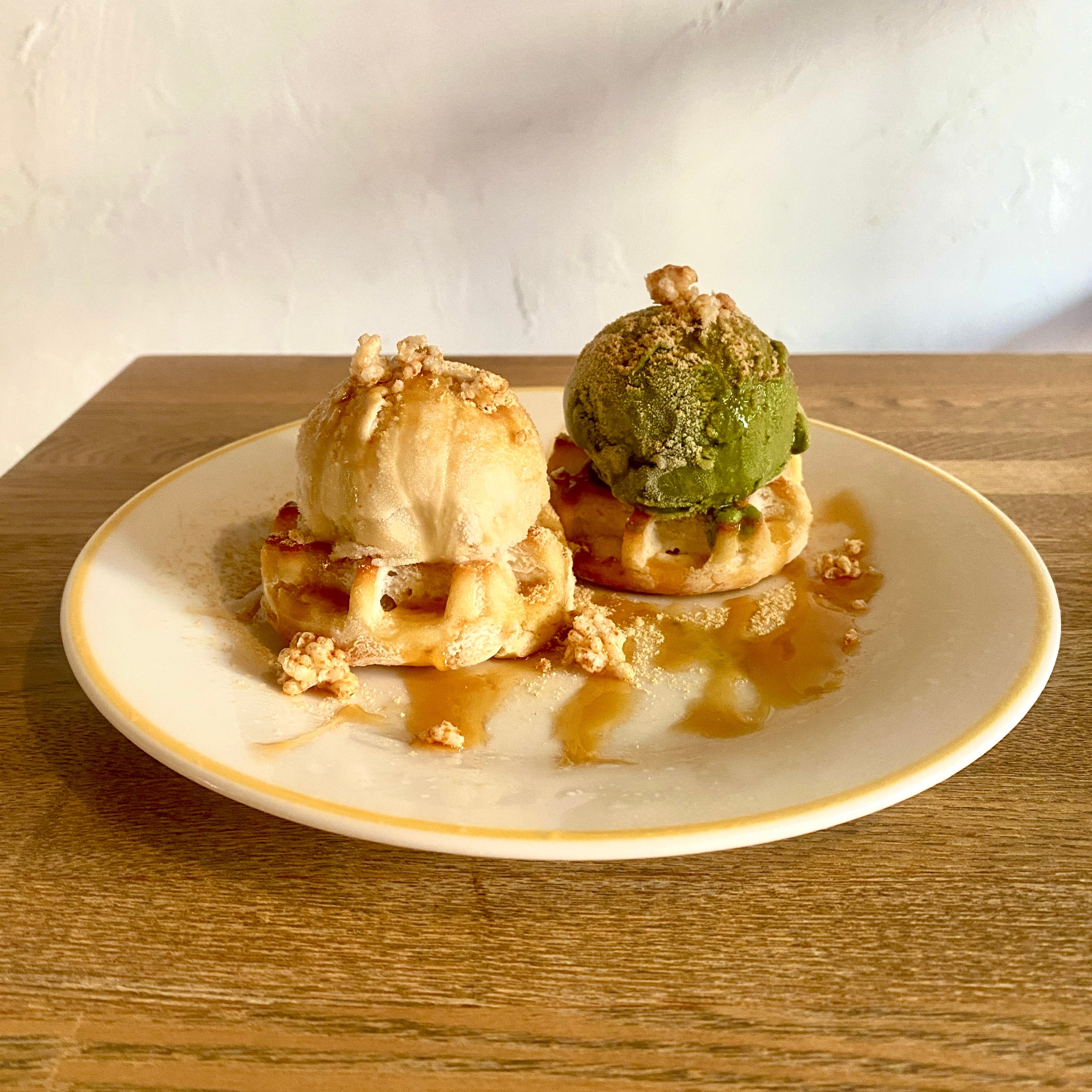 3.お皿にワッフルを盛り付け上にアイス2種を並べる