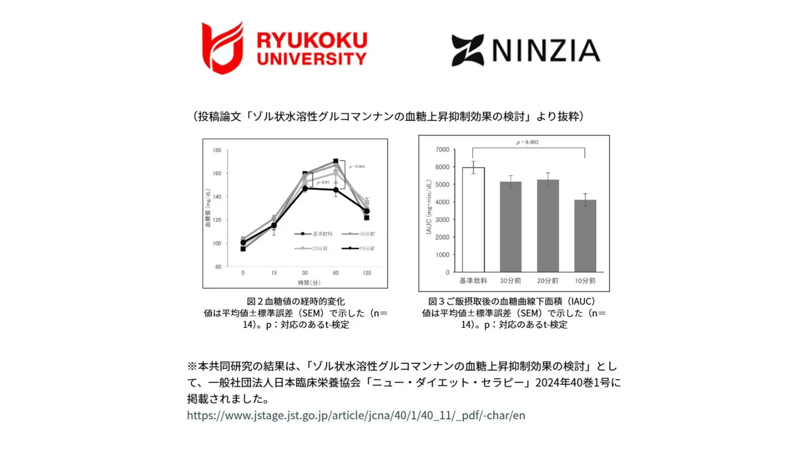 株式会社NINZIA(神戸市中央区、代表取締役:寄玉昌宏、以下「当社」※旧「株式会社Sydecas」)は、学校法人 龍谷大学(京都市、専務理事:入澤 崇、以下「龍谷大学」)との共同研究において、当社独自の蒟蒻繊維素材「ニンジャペースト」による、血糖値及び血糖上昇曲線下面積(IAUC)の減少を確認しました。これは、ニンジャペーストに含まれる水溶性グルコマンナンが胃内に滞留し、血糖上昇を抑制したためと考えられます。日本栄養改善学会で発表、一般社団法人日本臨床栄養協会のジャーナルに掲載されました。