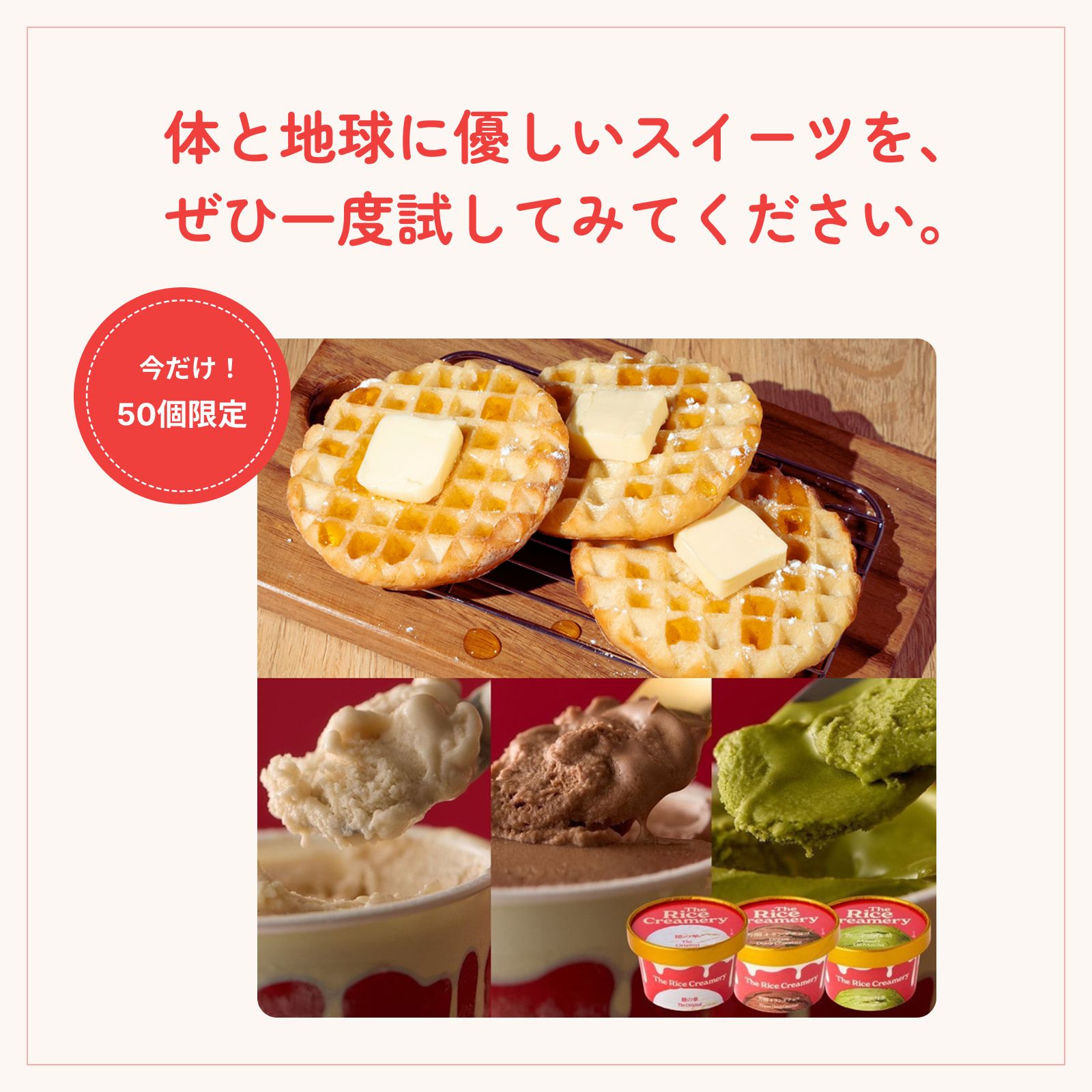 乳製品不使用の「お米がつくる、至福のアイスクリーム」と、グルテンフリーの豆腐ワッフルがモチリッチ ワッフルアイスセットで新登場!