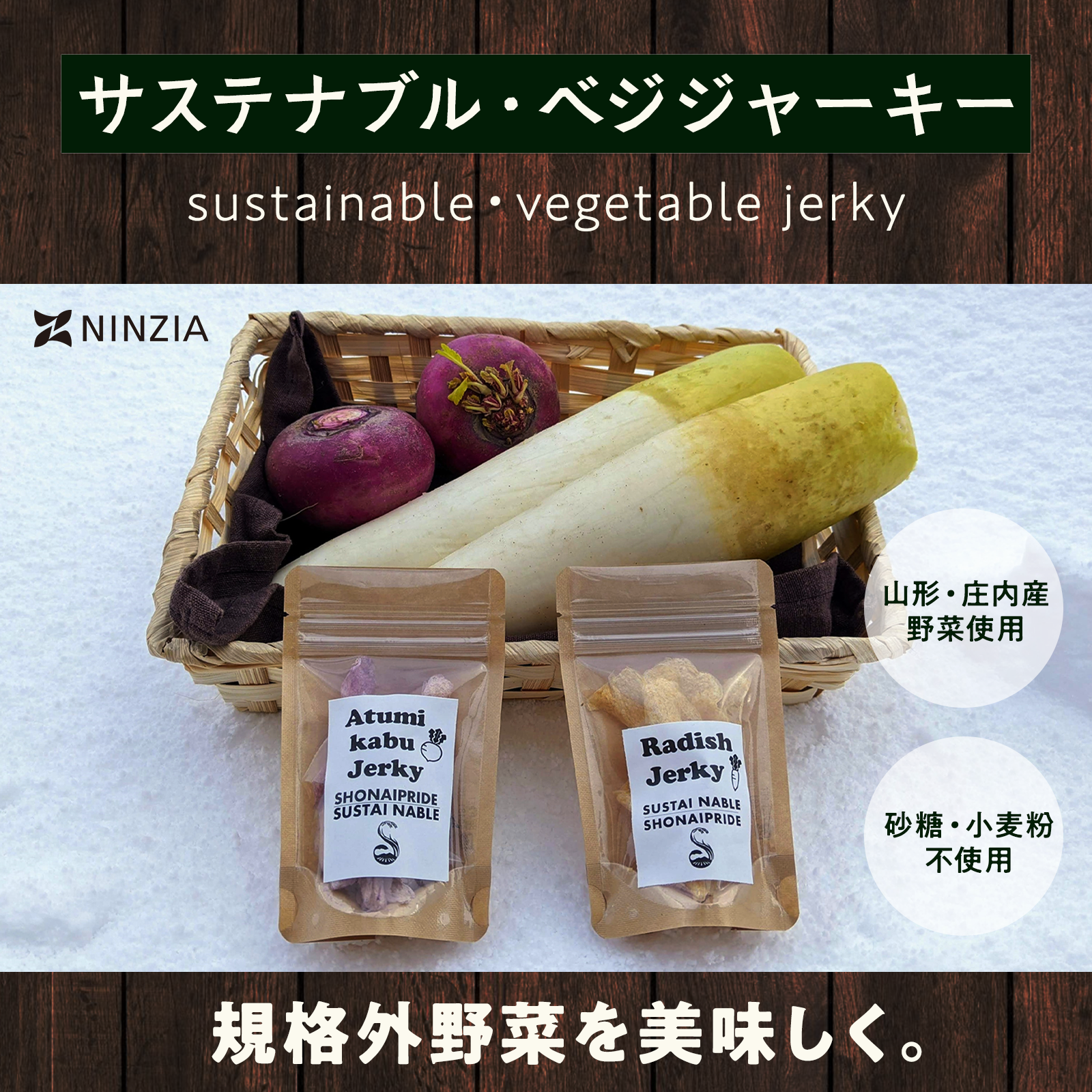 規格外として廃棄せざるを得ない野菜を、次世代蒟蒻素材NinjaPasteによって生まれ変わらせる「サステナブル・ベジジャーキーシリーズ」。